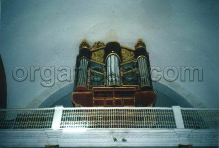 1 juego de lengüetería en fachada, oculto y montado en un cajón al frente del instrumento, con su respectiva tapa y cerradura para acceder a la afinación. Por la profundidad del cajón, y debido a la escasa longitud de los resonadores, suponemos que se trate de 1 juego "bajoncillo o Dulzaina 4'", completo para todo el teclado. |