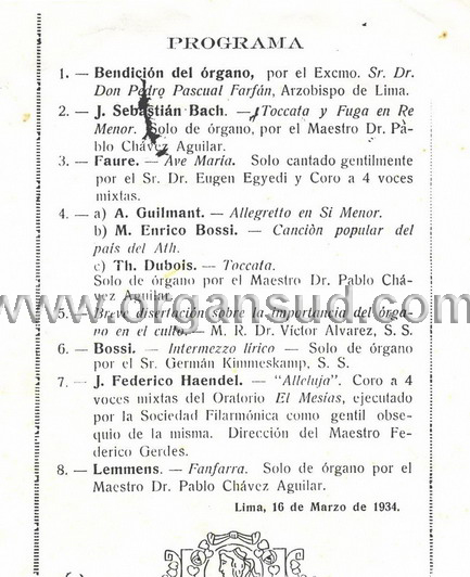 El instrumento fue entregado en Noviembre de 1993 siendo reinaugurado el 1 de Diciembre de 1993 con un gran concierto ofrecido por el organista Italiano Alberto Pavoni que fue traído por la Embajada de Italia en el Perú, y el cual expresó su total satisfacción por el trabajo de restauración realizado.